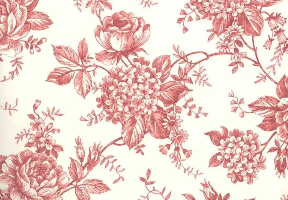Este papel tiene una decoración de hortensias y rosas con hojas todas en tonos rosas.