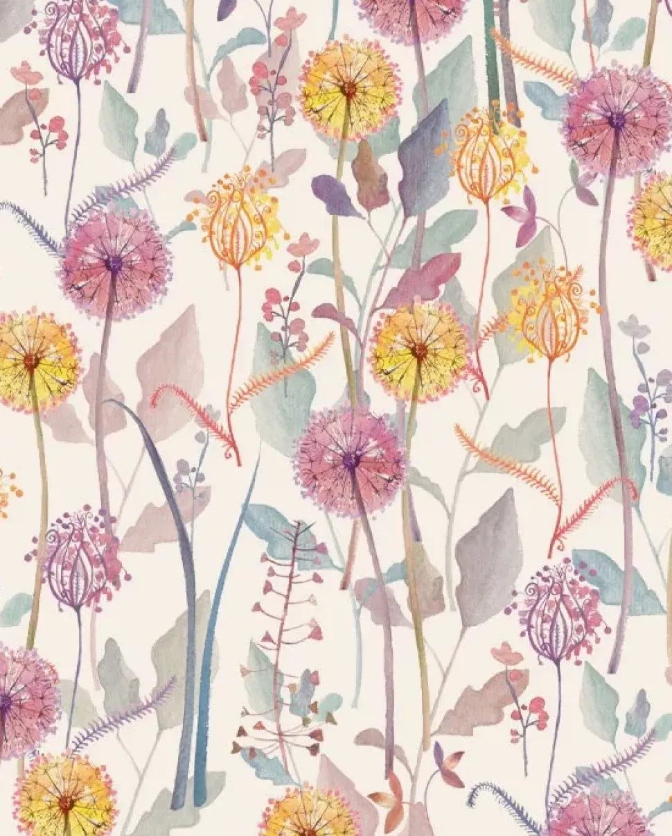 - Diseño de «Magia de las flores» con diferentes clases de dientes de león y otras clases de flores en tonos morados, amarillos y azules.