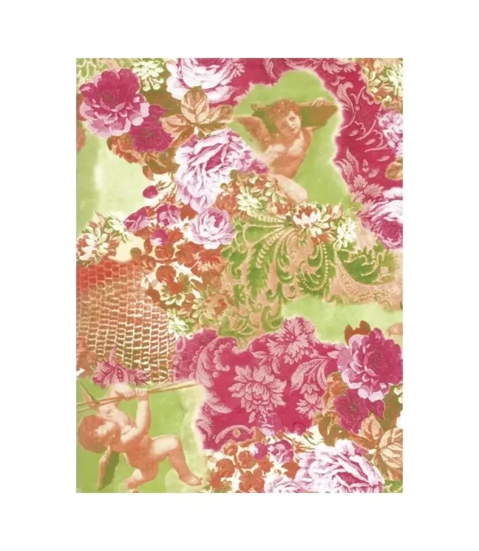 - Papel impreso con ilustraciones de Ángeles y flores en tonos rosas y verdes.