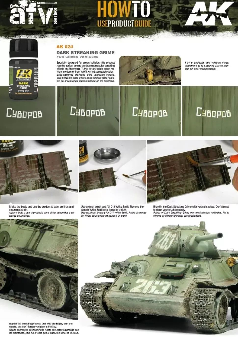 - Este producto de base enamel está indicado para representar fácilmente efectos de suciedad escurrida y acumulada sobre colores verdes o marrones.