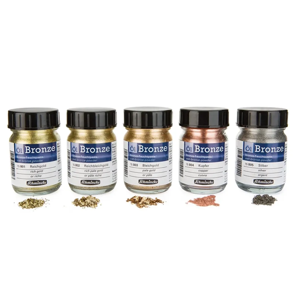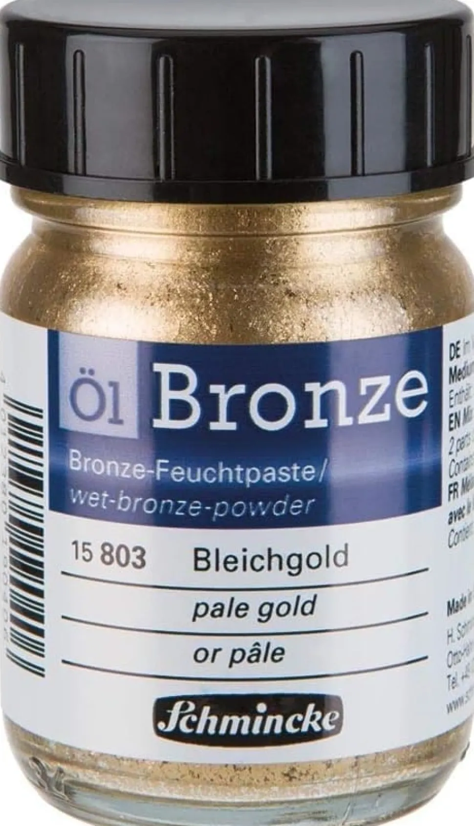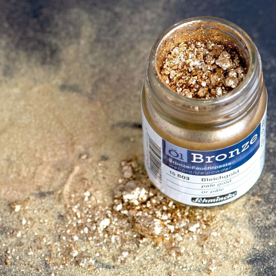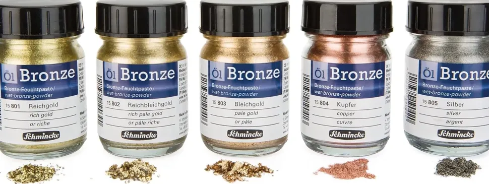 - Los bronces al óleo permiten lograr efectos metálicos brillantes en pinturas al óleo y otras superficies imprimadas, como madera, metal o yeso.