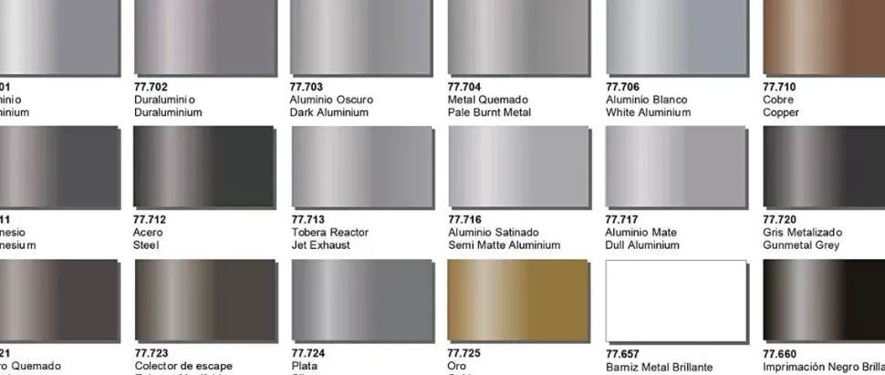 - La gama ofrece un amplio abanico de tonos con el fin de imitar el acabado metálico de aviones de cualquier tipo y época.