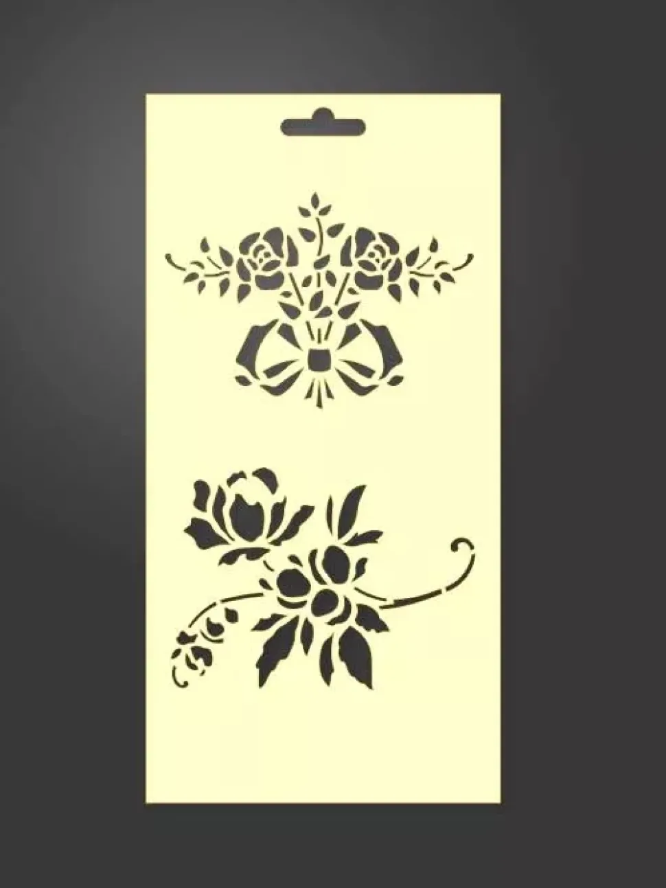 Modo de empleo: cubrir la zona a decorar con la plantilla y aplicar el color o la textura con aplicadores tales como pinceles, esponjas, espátulas, sprays, incluso los propios dedos.