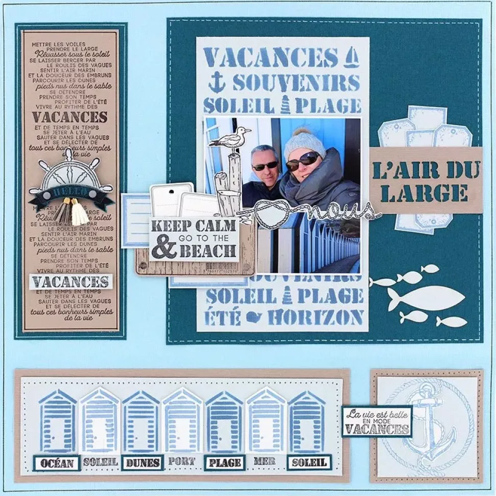 - Contiene casitas de playa y las palabras vacances, souvenirs, soleil, plage, été, horizon.