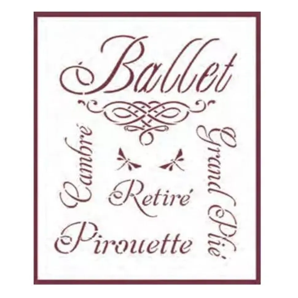 Diseños en acetato de motivos clásicos y actuales para la técnica del estarcido. Incluye palabras como: Ballet, Pirouette, Cambré, etc.