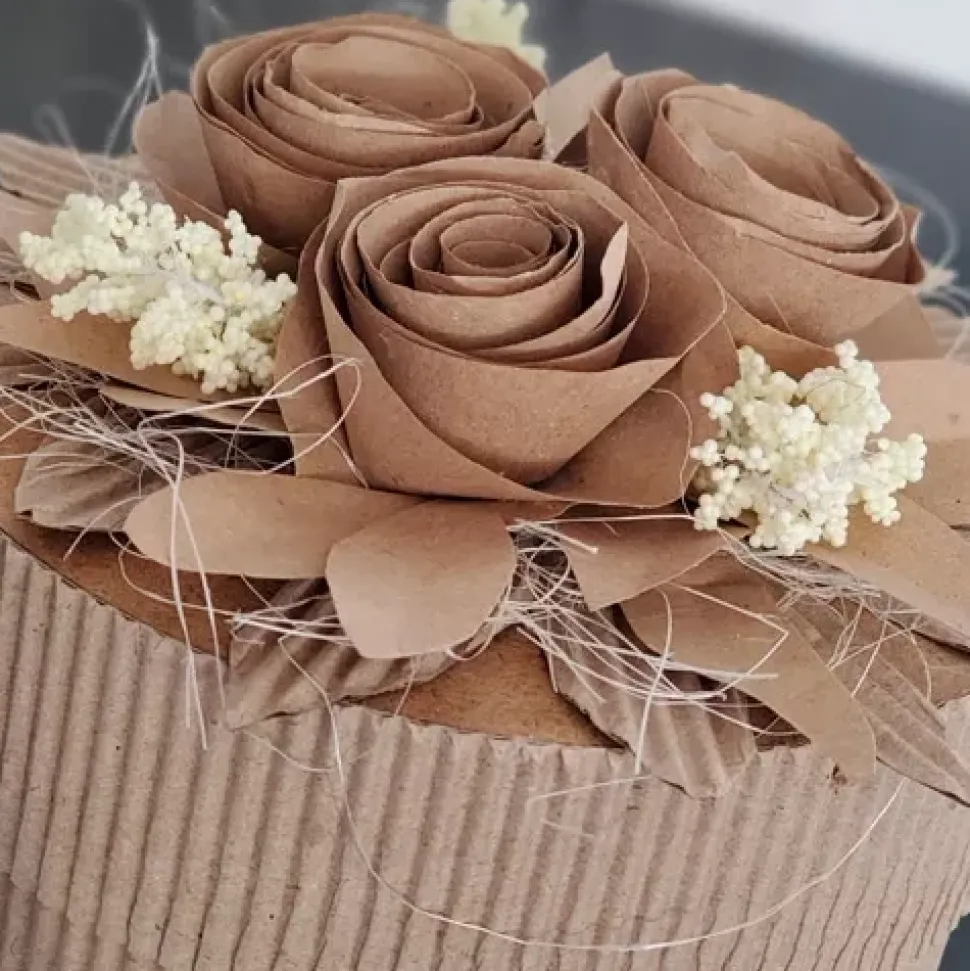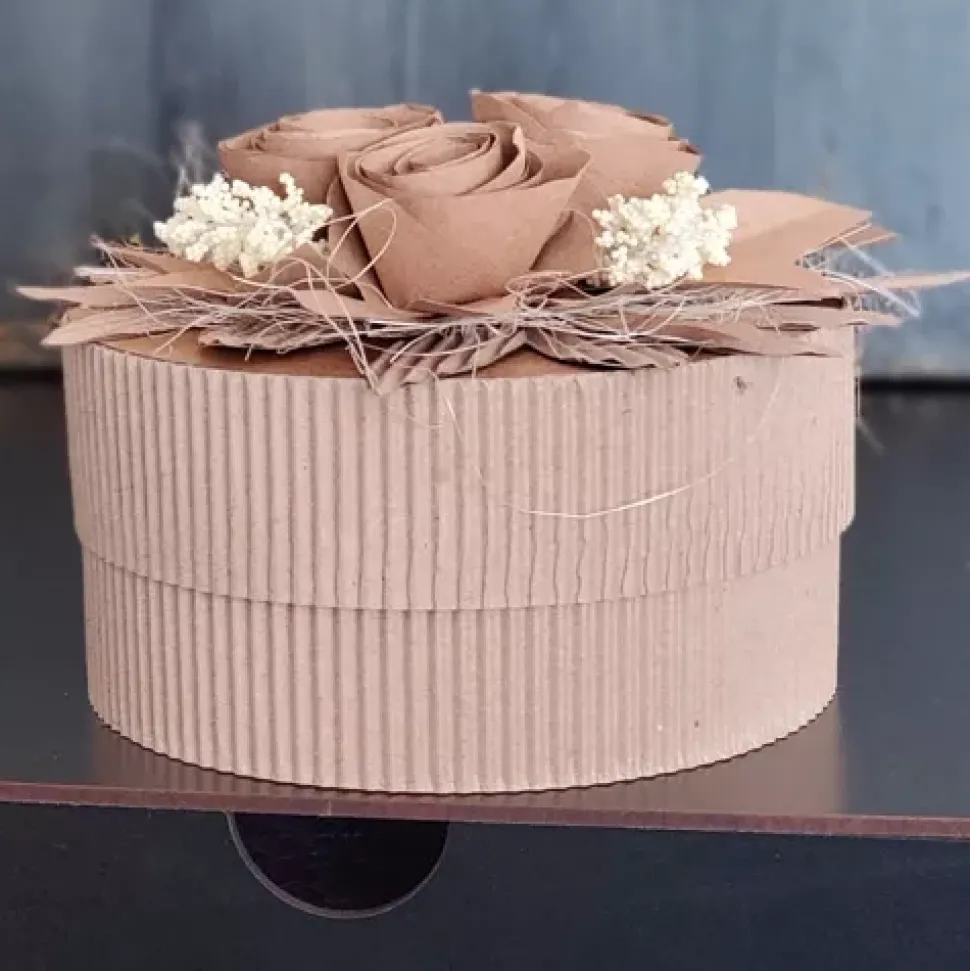 - Con este set podrás crear 3 cajas circulares de color kraft con cartón corrugado.