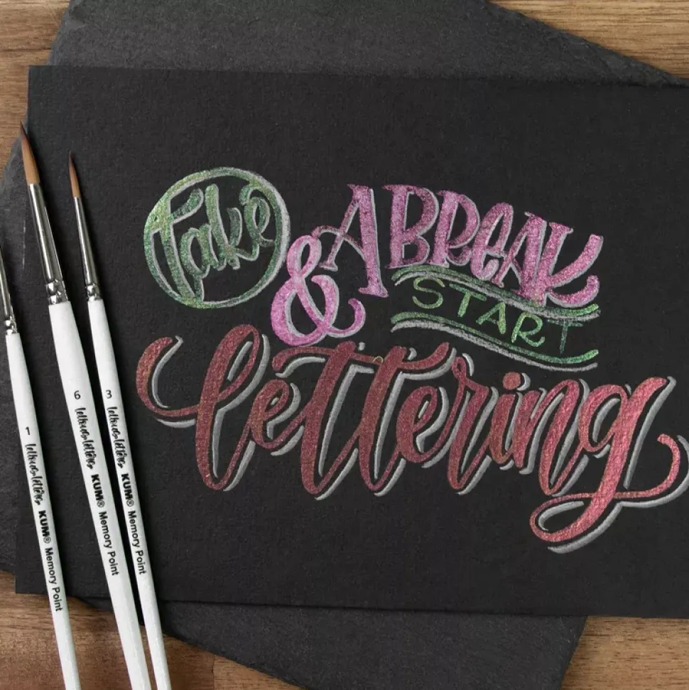 - Gracias a sus propiedades únicas, el pincel KUM Memory Point es especialmente adecuado para lettering, debido a su capacidad para crear líneas finas y gruesas en una sola pincelada, dando a las palabras un diseño extra especial.