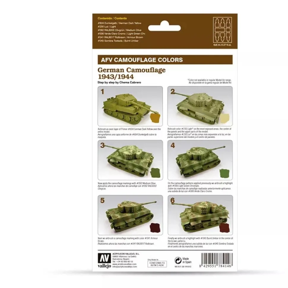 - El set contiene colores de camuflaje Wehrmacht (1943-44), para vehículos blindados. Incluye paso a paso de Chema Cabrero.
