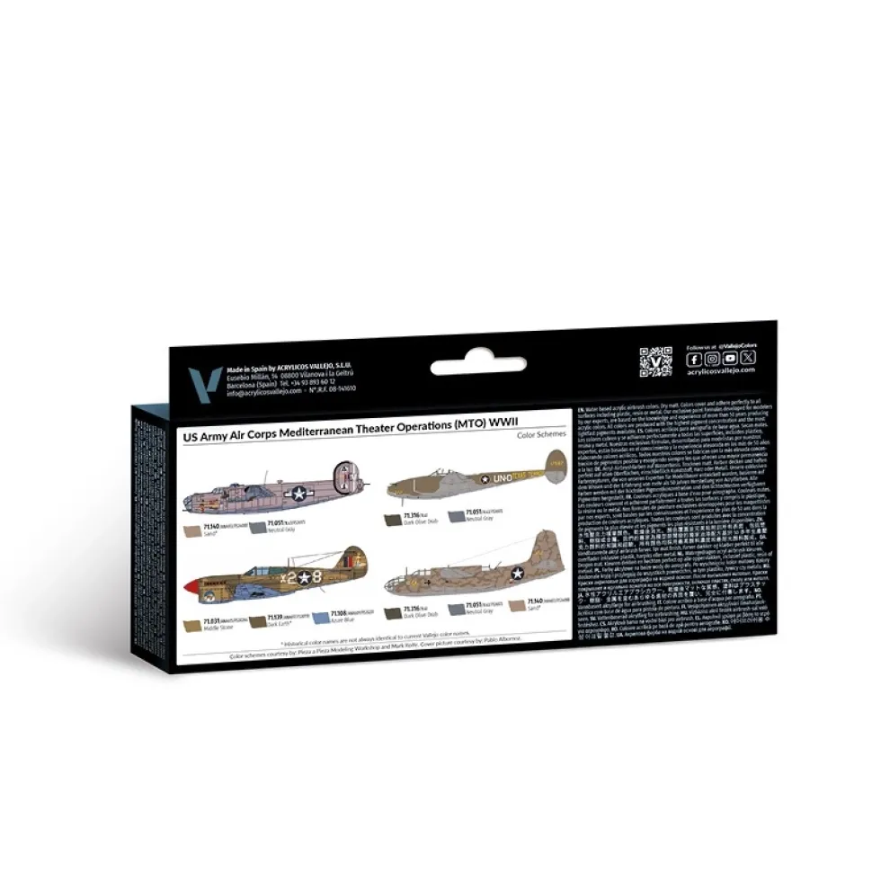 - Estuche de colores Model Air desarrollado para pintar los esquemas de camuflaje de la mayoría de los aviones del US ARMY AIR CORPS utilizados en el Teatro de Operaciones Mediterráneo (MTO) durante la Segunda Guerra Mundial.