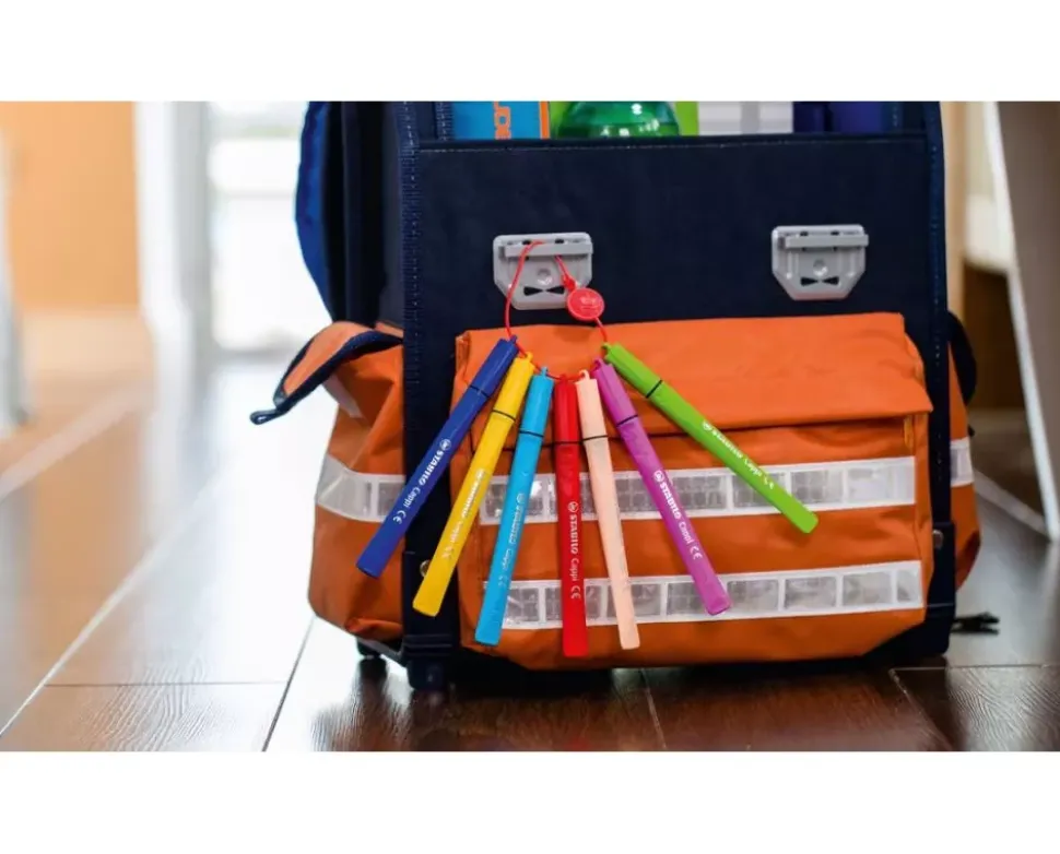 - Rotuladores con una anilla en el tapón que facilita la unión entre ellos mediante una cuerda de plástico y hace imposible perderlos.