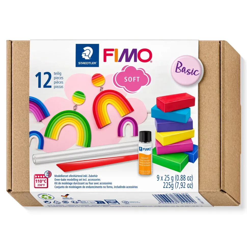 - – 9 medias pastillas FIMO Soft de 25 gr cada una de los colores: blanco, amarillo limón, rojo indio, azul brillante, naranja, verde tropical, púrpura, chocolate y negro.
