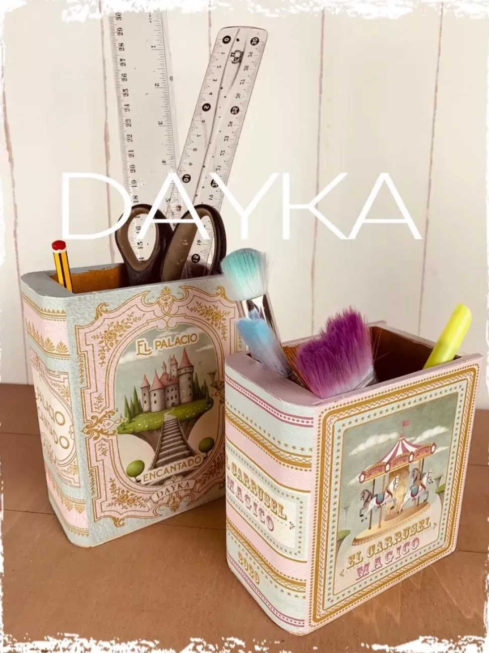 - Están decorados imitando la portada y el lomo de un cuento infantil con motivos de carrusel y palacio encantado.