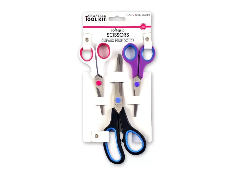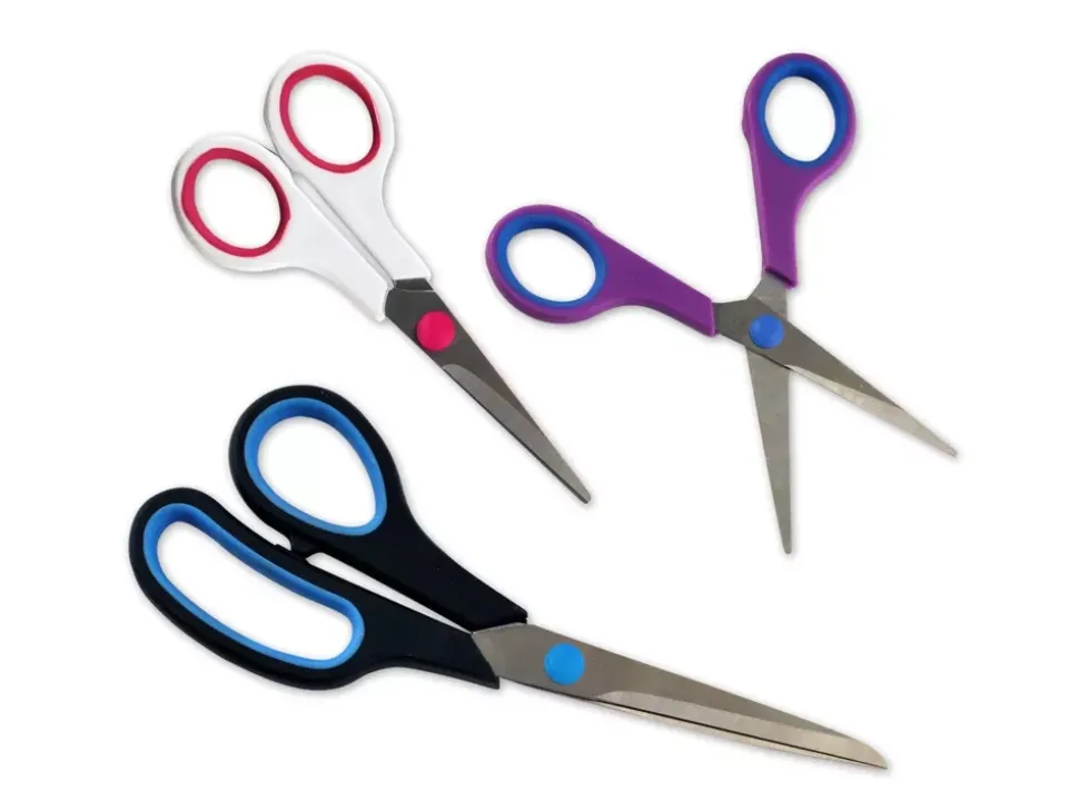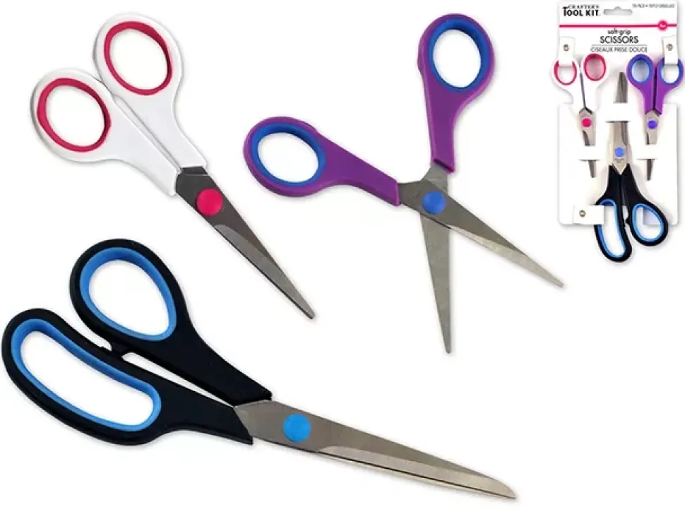 - Incluye tres tijeras de diferentes tamaños con mango universal en diferentes colores.