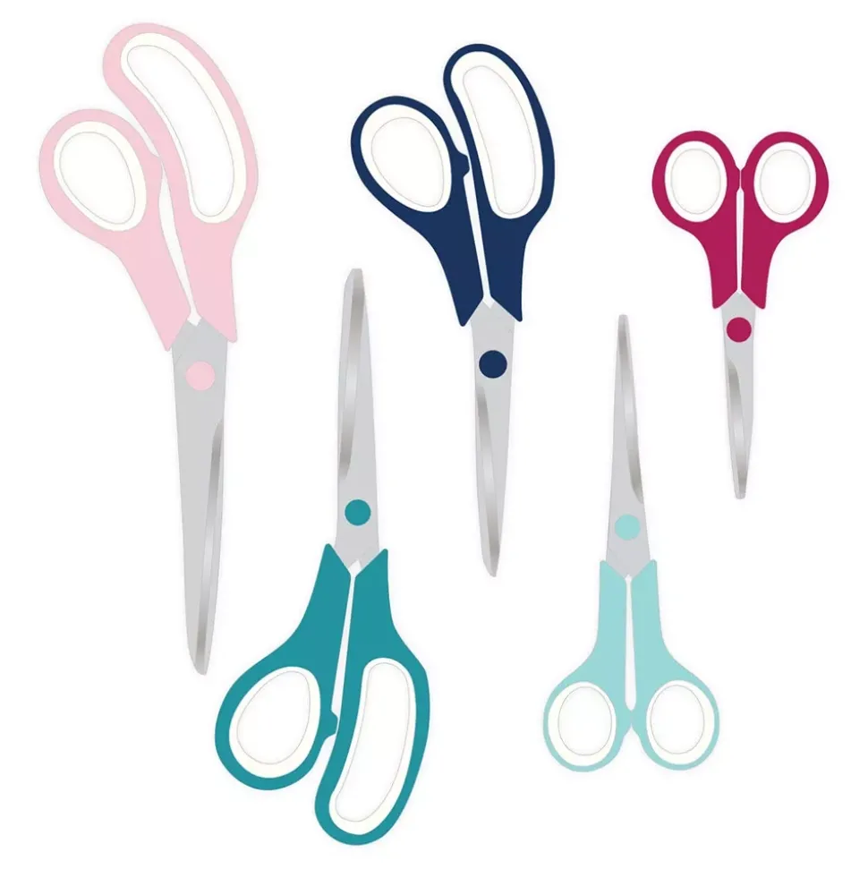 - Juego de 5 tijeras multiusos con mangos de fácil agarre en diferentes colores.