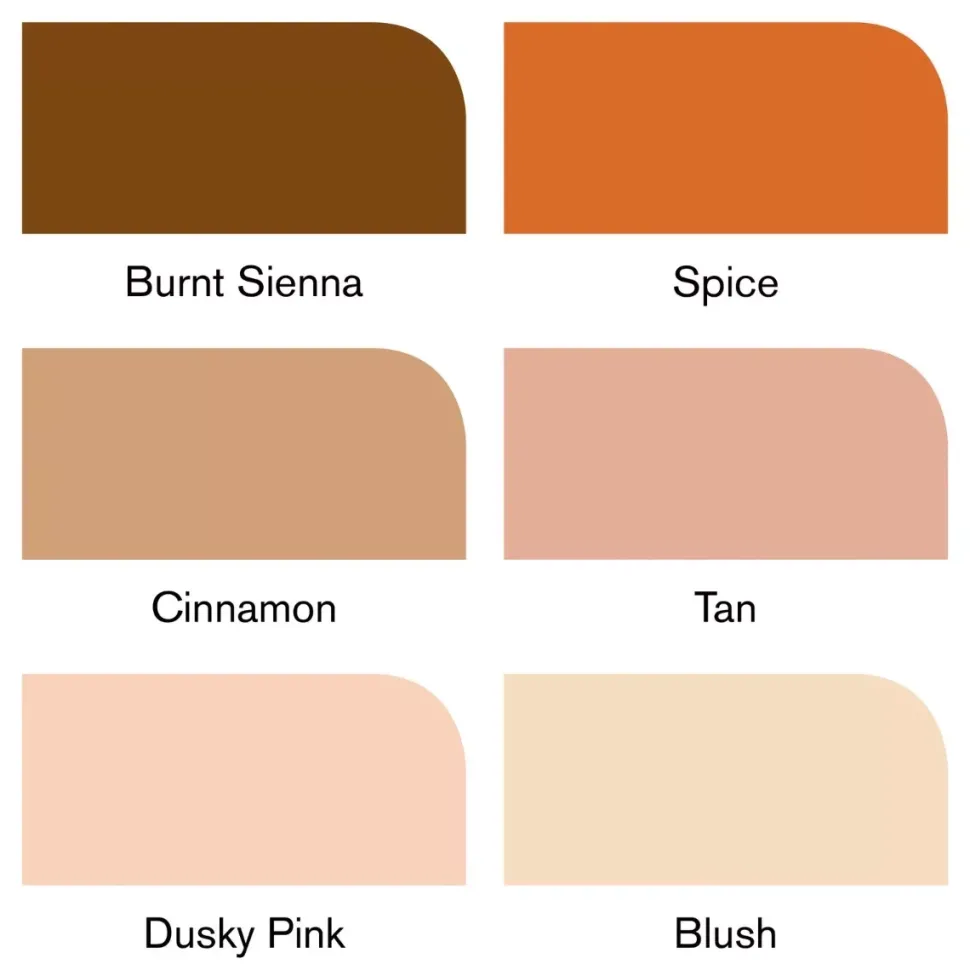 - Colores: Siena oscuro, Condimento, Canela, Marrón claro, Rosado oscuro y Sonrojo.
