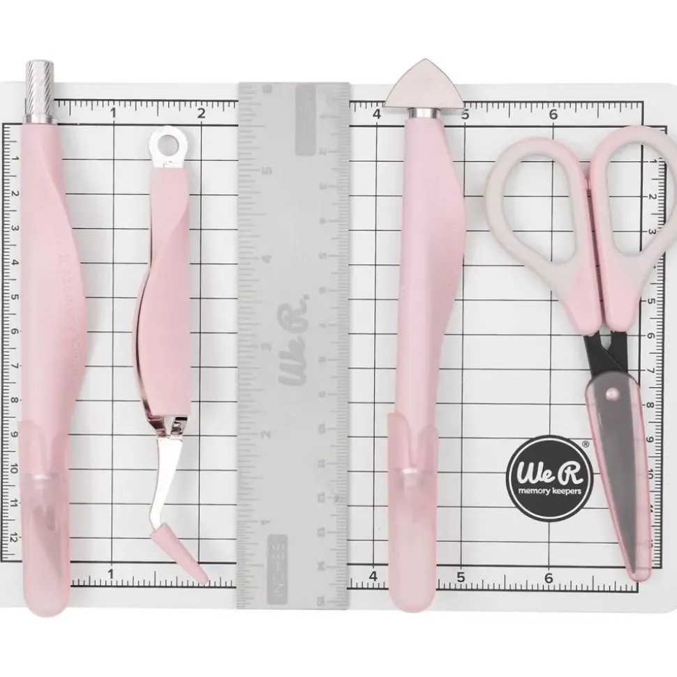 - Color: Las herramientas son rosas y la base de corte es blanca.