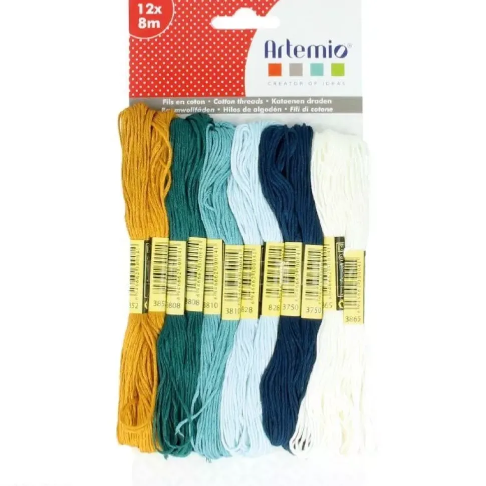 - Contiene 12 hilos de algodón en 12 colores: mostaza, blanco, azul o turquesas.
