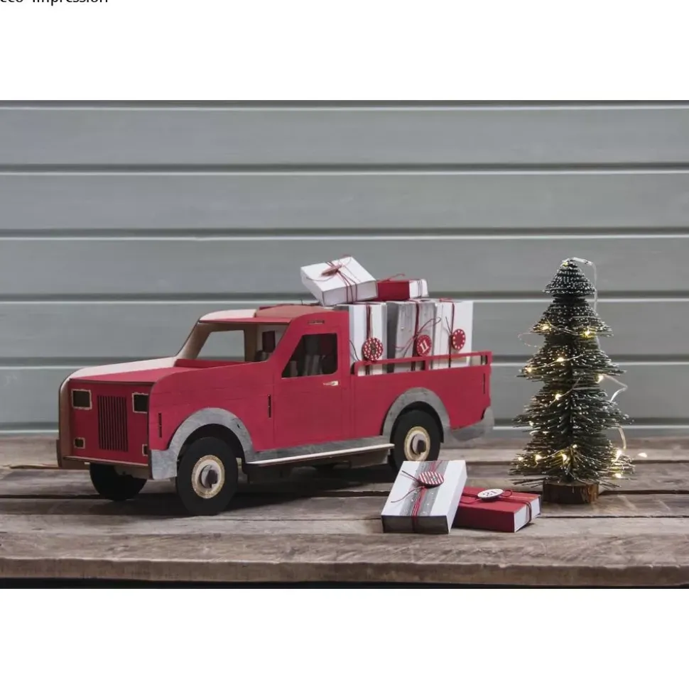 ¡Monta un divertida camioneta de madera en tres dimensiones! perfecta para proyectos navideños con un árbol de navidad cargado o un calendario de adviento original.