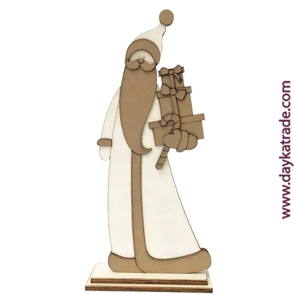 - Silueta de madera con forma de Papá Noel con regalos y peana.