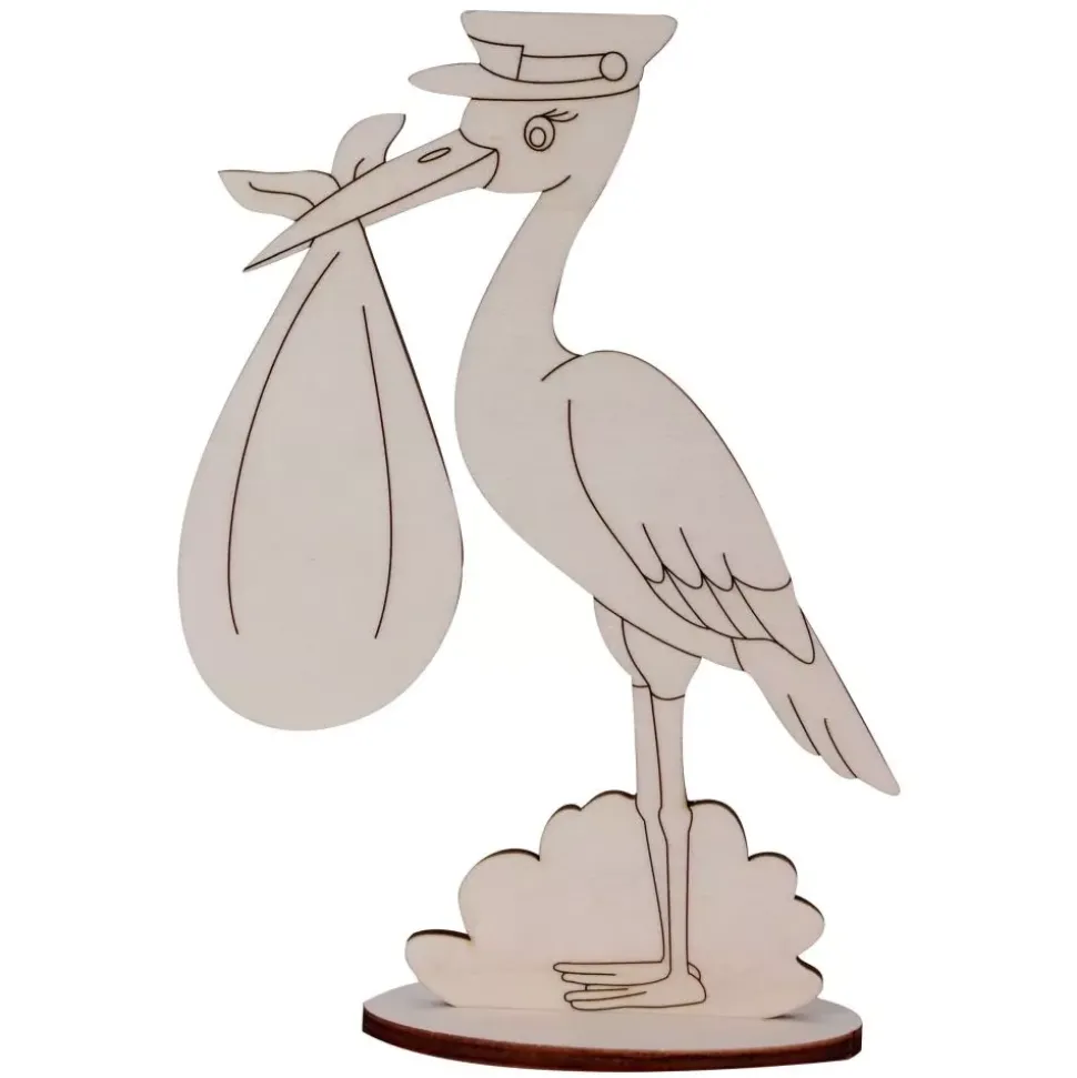 Siluetas de madera de chopo con motivo cigüeña mensajera con bebé.