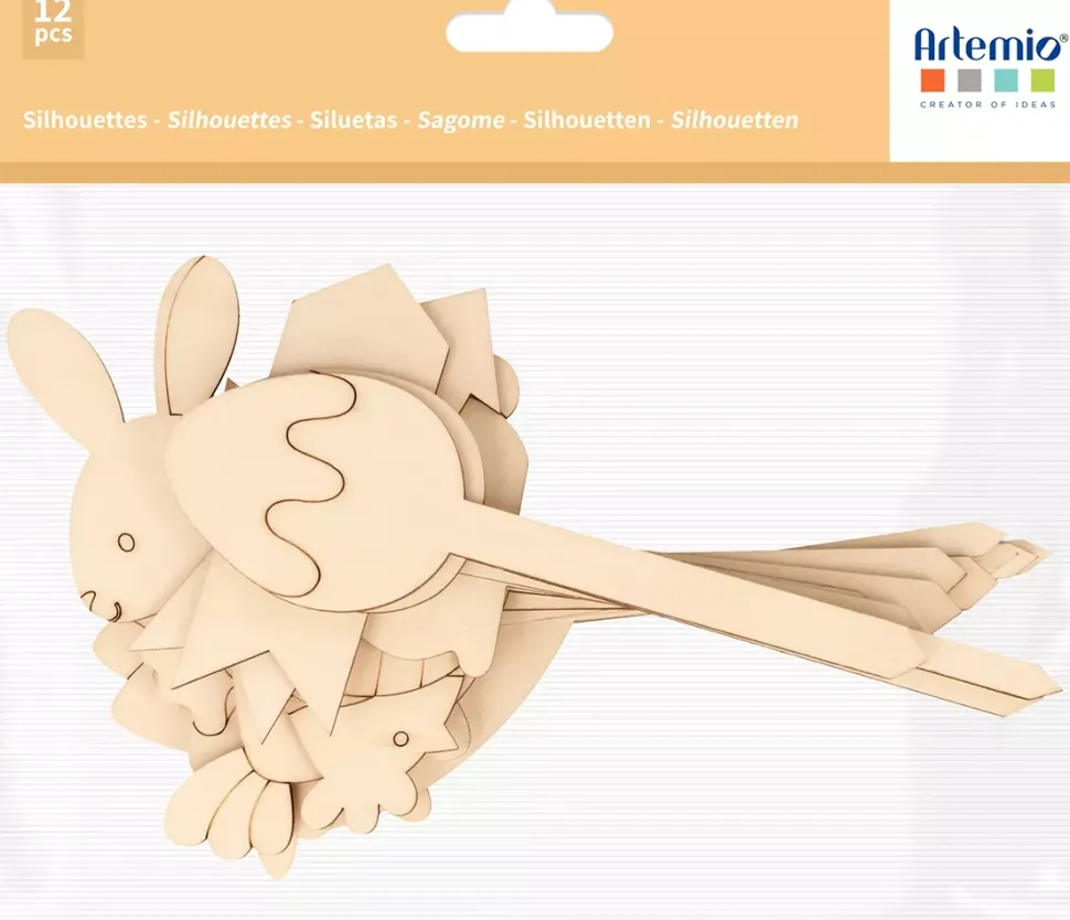 - 12 siluetas de madera con un palo acabado en punta, que permite clavarlo en la tierra de las plantas, en el jardín, en la arena…