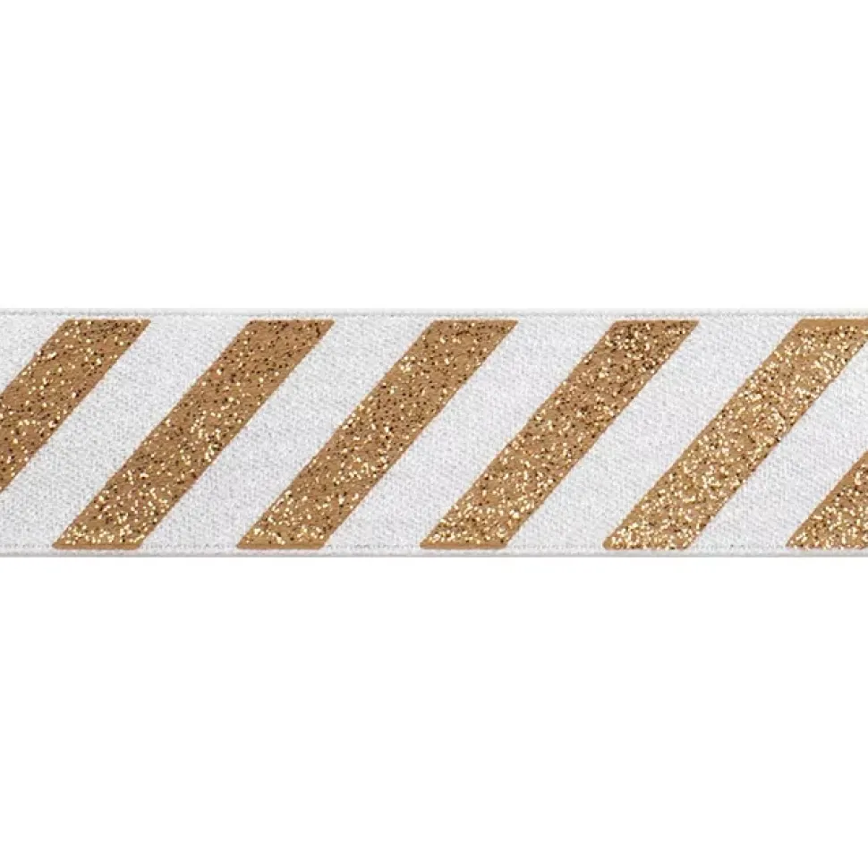 - La cinta tiene rayas oblicuas de glitter dorado.