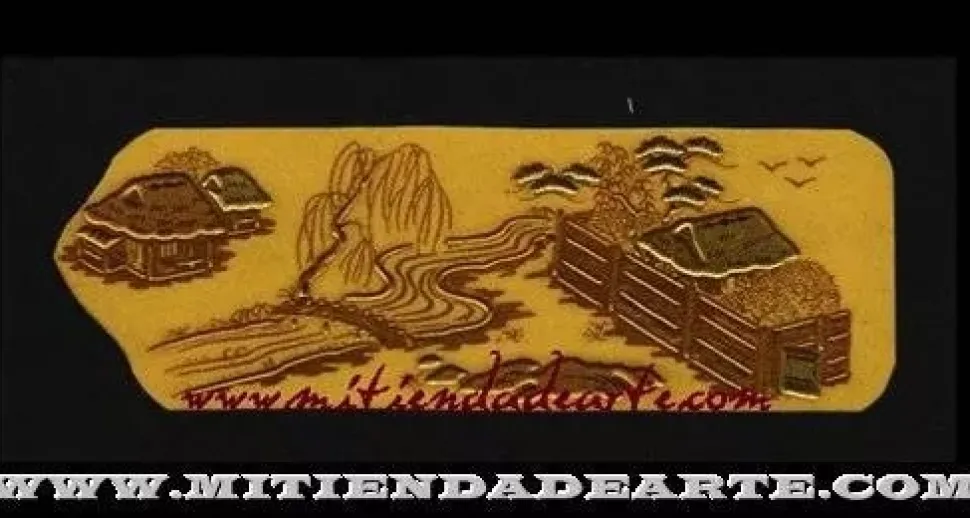 – MA-KI-E Figuras de pan de oro en relieve.- Escena rural casas granja río, puente y sauce en pan de oro en relieve matizado en sepia.- Formaro: 18×6 cm.- Se adhiere con cualquier tipo de cola suave.- Admite cualquier tipo de barniz, si bien recomendamos el uso de laca China transparente como terminación.