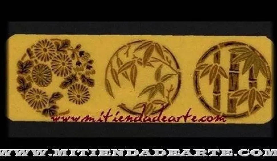 – MA-KI-E Figuras de pan de oro en relieve.- Figuras circulares con temas florales en pan de oro en relieve matizado en sepia – Formato: 3×3 (contiene 4 piezas)- Se adhiere con cualquier tipo de cola suave.- Admite cualquier tipo de barniz, si bien recomendamos el uso de laca China transparente como terminación.