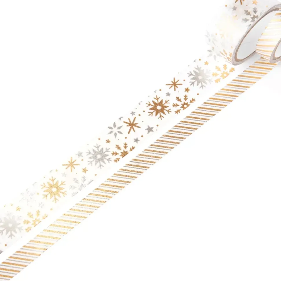 - Incluye ilustraciones de copos de nieve y rayas en colores foil dorado y plata.