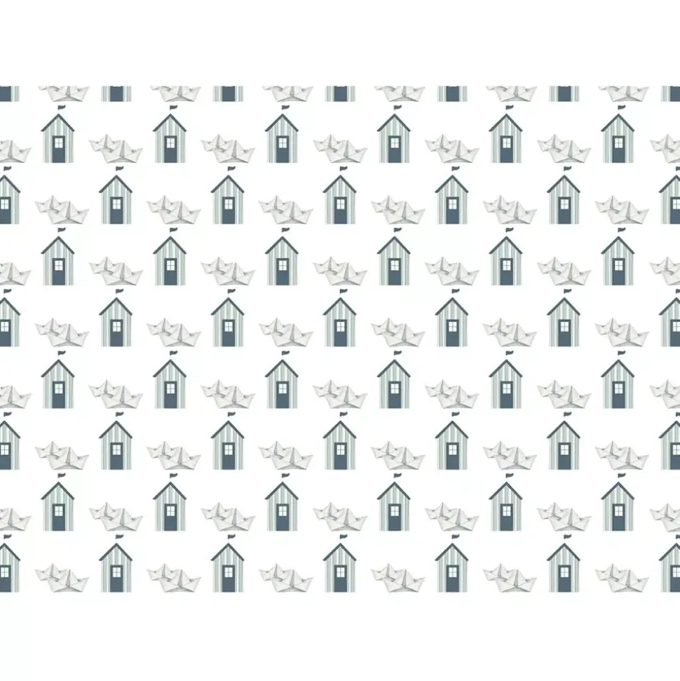 - Tela estampada con diseño de casitas azules y barquitos de papel sobre fondo blanco.