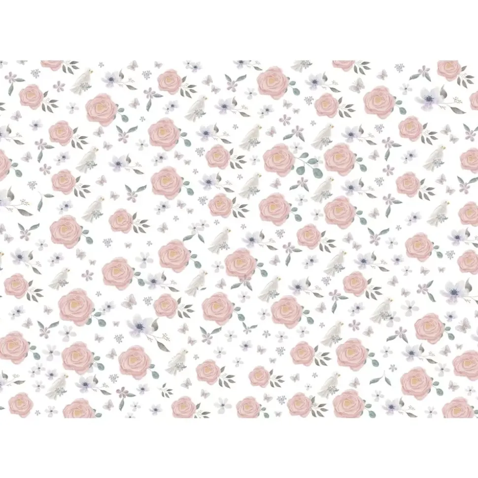 - Tela estampada con diseño de flores rosas y palomas blancas sobre un fondo blanco.