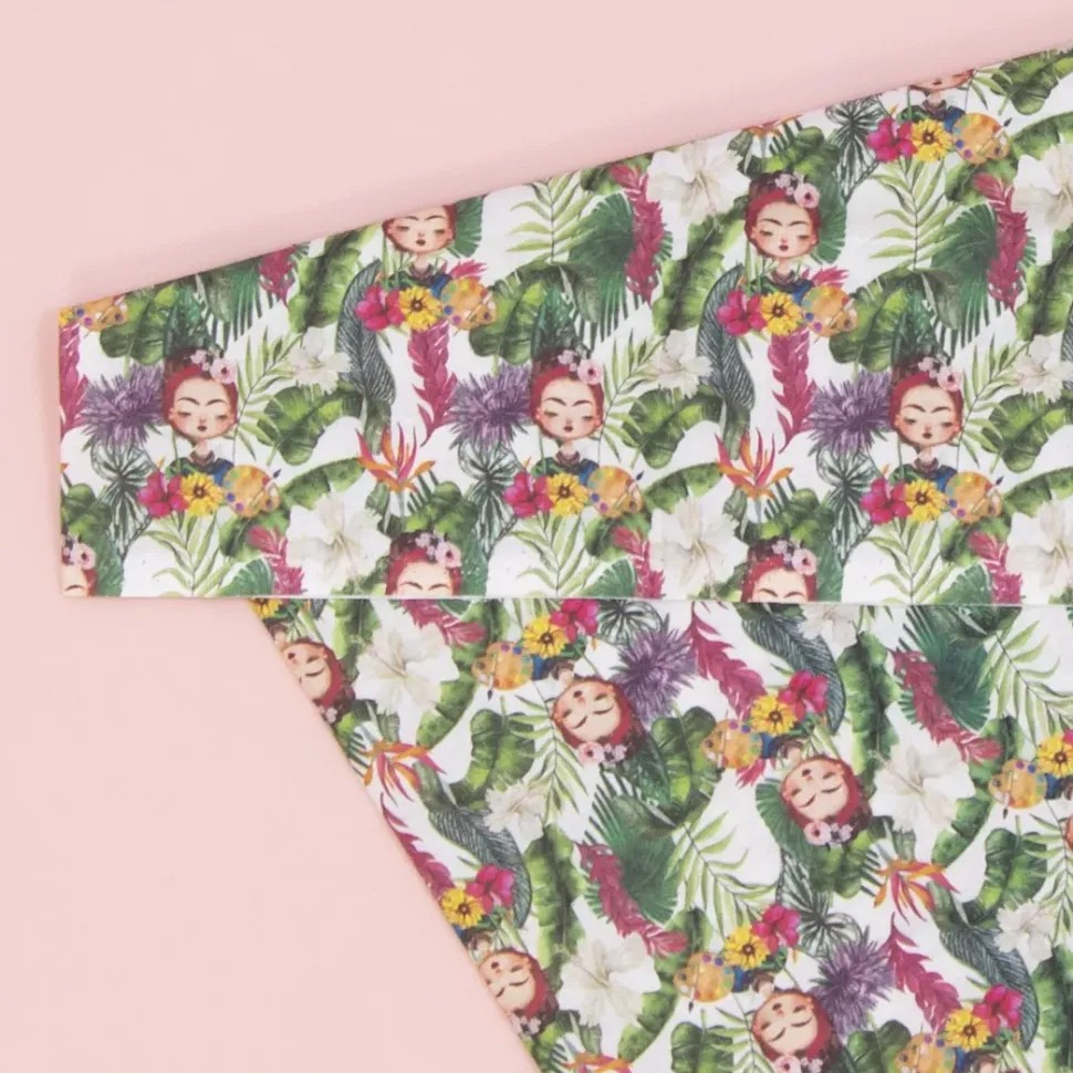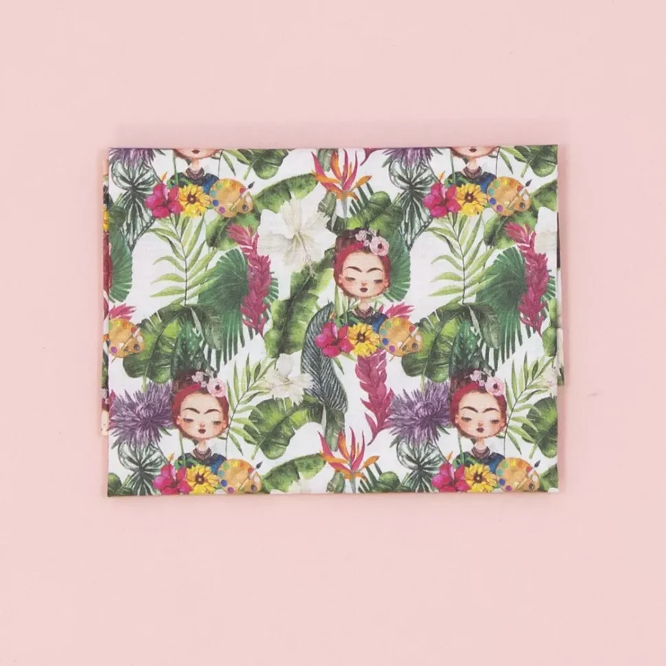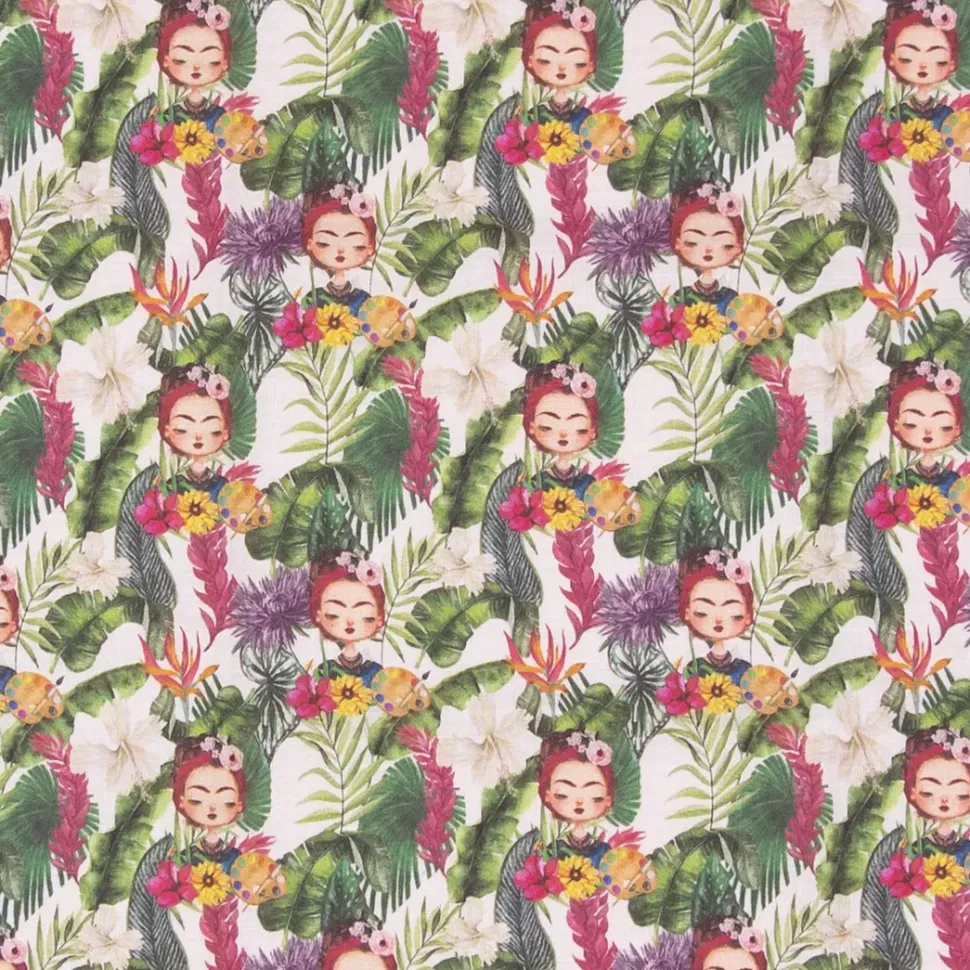 - Esta tela presenta un diseño que representa a Frida Kahlo sobre un fondo vegetal.