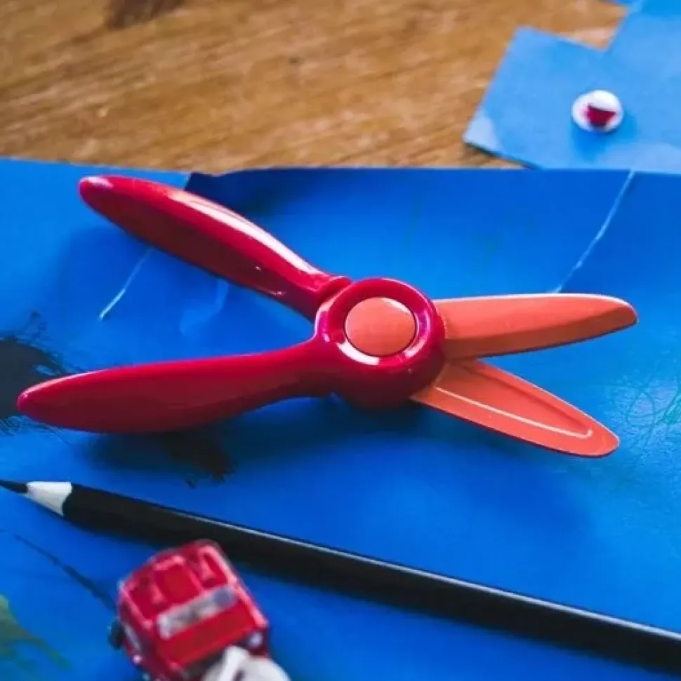 - Las hojas de seguridad de plástico y los mangos rectos sin aros facilitan el agarre y su diseño con resorte abre las hojas tras cada corte para los niños se centren exclusivamente en desarrollar el movimiento de cierre. Además, las hojas se abren a un ángulo mínimo para que puedan usarlas cómodamente sin perder el agarre.