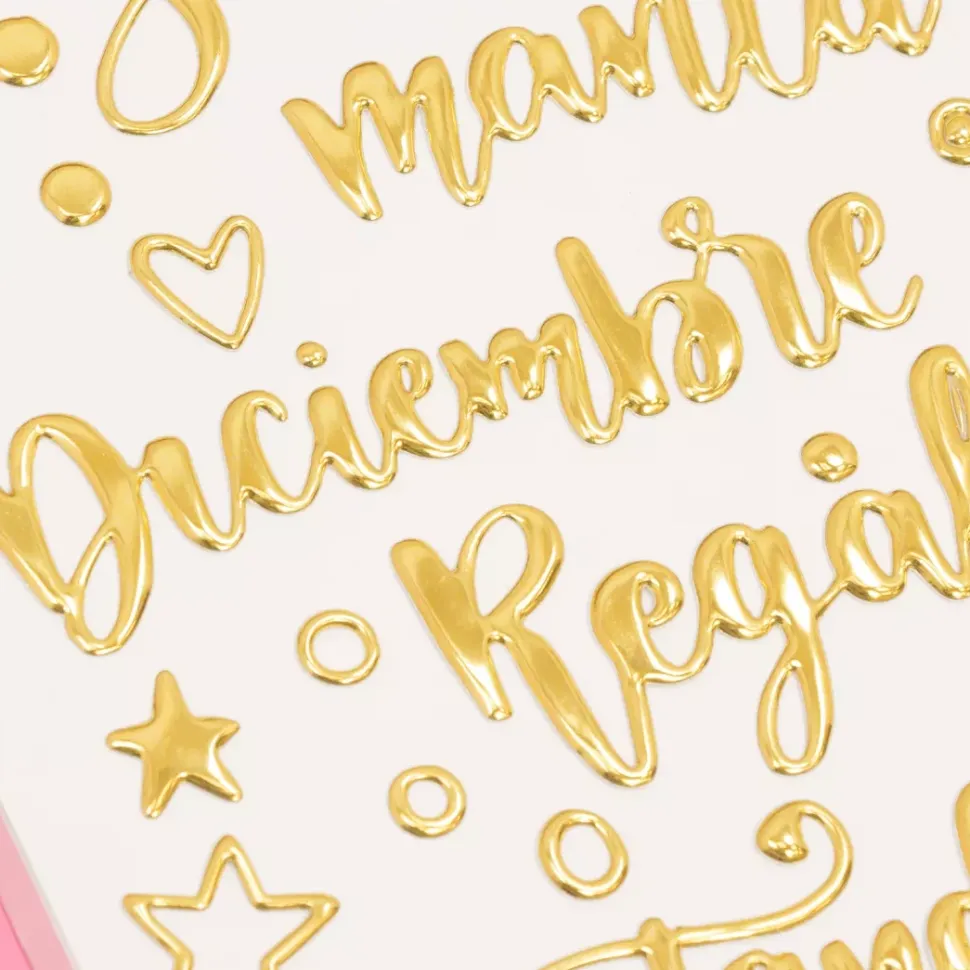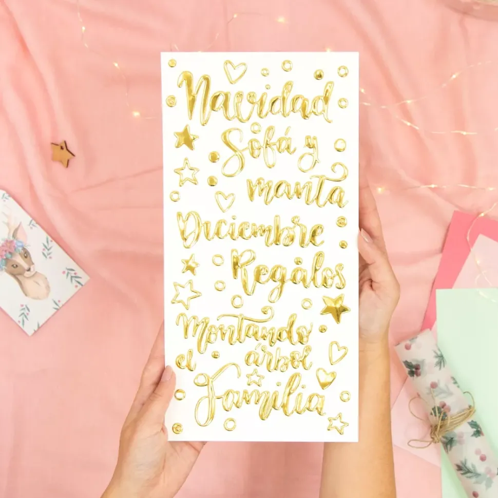 - Contiene palabras y frases en castellano como: «Navidad», «Sofá y manta», «Diciembre», «Regalos», «Montando el árbol» o «Familia». Además incluye círculos, puntitos, corazones y estrellas de diferentes tamaños.